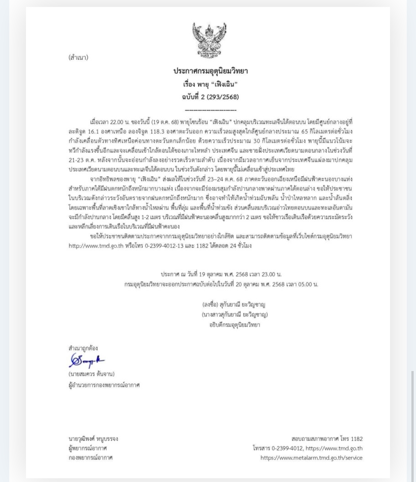 ประกาศ ณ วันที่ 19 ตุลาคม พ.ศ. 2568 เวลา 23.00 น. กรมอุตุนิยมวิทยาจะออกประกาศฉบับต่อไปในวันที่ 20 ตุลาคม พ.ศ. 2568 เวลา 05.00 น.